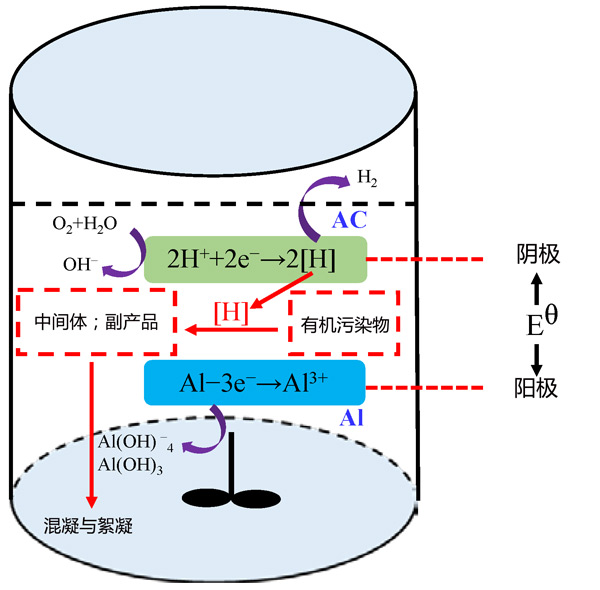 ¡¡¡¡¸ù¾Ýʵ¼Ê¹¤¿ö£¬Ìá³öÁËÒ»ÖÖ¿ÉÐеĻîÐÔÌ¿ÔØÂÁ΢µç½â¹¤ÒÕ·Ö½âË®Éú»·¾³ÖÐÓлúÎÛȾÎïµÄ·´Ó¦»úÀí(ͼ2)¡£ÓÉÓÚÆä¸ßÎü¸½ÈÝÁ¿ºÍµçµ¼ÂÊ£¬»îÐÔÌ¿±»ÓÃ×÷Òõ¼«±£»¤¡£ÔÚÑô¼«(ÂÁ·ÏÁÏ)£¬ÓÉÂÁÌṩµÄµç×Óͨ¹ý΢ÐÍÔµç³Ø×ªÒÆµ½Òõ¼«(»îÐÔÌ¿)£¬Îü¸½ÔÚÒõ¼«±íÃæµÄÓлúÎÛȾÎïÊܵ½ÕâЩÊͷŵĵç×ӵĹ¥»÷¡£Ë®µçÀë²úÉúµÄH+ÔÚÒõ¼«»ñµÃµç×Ó²¢²úÉú¾ßÓÐÇ¿»¯Ñ§·´Ó¦ÐԵĻîÐÔÇâ[H]»òH2,ºÍ»îÐÔÇâ[H]·¿ÉÒÔ²¿·Ö½µ½âÓлúÎÛȾÎï¡£´ËÍ⣬AlʧȥÈý¸öµç×ÓÐγÉÂÁÀë×Ó(Al3+)¡£È»ºó£¬ÂÁÀë×Ó³ÁµíÐγÉÇâÑõ»¯ÂÁ(Al(OH)3¡¢Al(OH)-4µÈ)¡£×÷ΪÓÐÀûµÄÐõÄý¼Á£¬ÕâЩÇâÑõ»¯ÂÁ¿ÉÒÔÓÐЧȥ³ý·ÏË®ÖеÄÓлúÎÛȾÎï¡£Äѽµ½âÎÛȾÎïÔÚ»îÐÔÌ¿ÔØÂÁ΢µç½â¹¤Òյĸ¨Öúϱ»·Ö½âΪС·Ö×ÓÖмäÌ壬Ҳ¿ÉÒÔͨ¹ýÇâÑõ»¯ÂÁÐõ×´ÎÛÄàµÄÐõÄý¹²³ÁµíÀ´Ïû³ý¡£»»ÑÔÖ®£¬Óë»îÐÔÌ¿ÔØÂÁ΢µç½â¹¤ÒÕÏà¹ØµÄÐí¶àÐͬЧӦ¿ÉÒÔÓÐЧµØ·Ö½âË®»·¾³ÖеÄÓлúÎÛȾÎï¡£