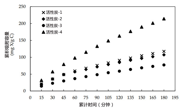 活性炭是去除有机物的常用吸附剂。吸附性能主要取决于其比表面积和微孔结构。它们具有较高的内部孔隙率,因此具有较高的吸附性。在本研究中,对四种具有不同表面性质的颗粒活性炭样品(活性炭-1、2、3和4)进行了去除黄药的测试。将两克活性炭样品与50毫升1590毫克/升的黄药溶液混合15分钟。过滤活性炭,并用紫外-可见光谱法测量溶液中的残余黄药。通过重复使用碳样品,重复该程序12次,以达到大吸附量。如图1所示,活性炭-4的吸附容量比较高,因此选择其进行进一步研究。