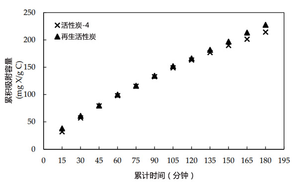 活性炭具有一定的吸附能力。随着越来越多的成分被吸附在其表面上,吸附能力会随着时间的推移而降低。一旦达到最大吸附容量,就不能再有效使用。对于活性炭样品的再生,吸附的成分可以通过加热破坏。在这部分研究中,在其表面吸附黄原酸盐的废活性炭样品通过在550℃下加热1小时进行再生。图2比较了初始活性炭和再生活性炭样品的吸附性能。再生活性炭和活性炭样品的累积吸附黄药量相差不大。结果表明,吸附在用过的活性炭上的黄药被破坏了,它被有效地恢复并可以重复使用。