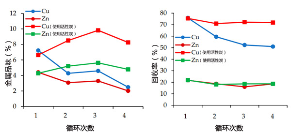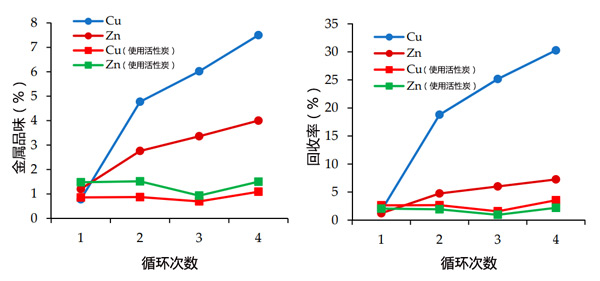 图4:使用活性炭和不使用活性炭进行水处理时,Cu和Zn的品位和对粗铜精矿的回收率。