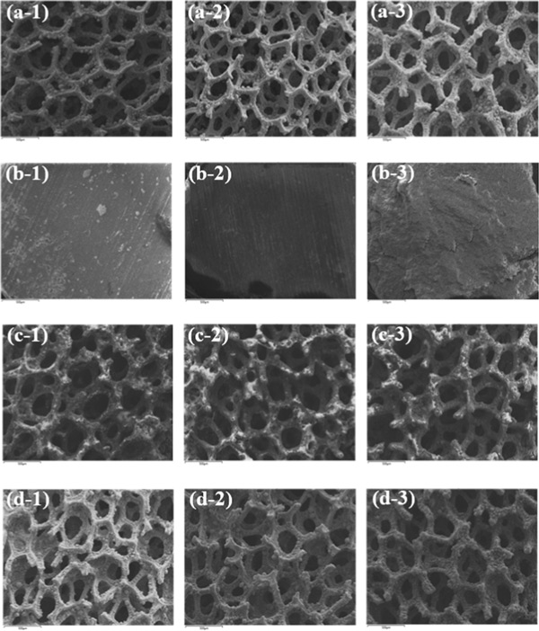 ¡¡¡¡Í¼1£º(a)½ðÊôÅÝÄ´ß»¯¼Á¡¢(b)HZSM-5¿ÅÁ£´ß»¯¼Á¡¢(c)HZSM-5/½ðÊôÅÝÄ´ß»¯¼ÁºÍ(d)»îÐÔÌ¿/½ðÊôÅÝÄ´ß»¯¼ÁµÄSEMÕÕÆ¬£¬·´Ó¦Ç°µÄ´ß»¯¼Á(a-1¡¢b-1¡¢c-1¡¢d-1)¡¢450¡æ·´Ó¦ºóµÄ´ß»¯¼Á(a-2¡¢b-2¡¢c-2¡¢d-2)¡¢´ß»¯¼ÁÔÚ550¡æ·´Ó¦ºó(a-3,b-3,c-3,d-3)¡£