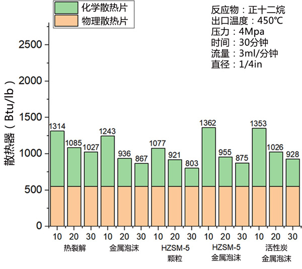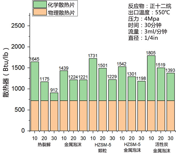 ¡¡¡¡ÔÚ550¡æÎ¶ȺÍ4MPaѹÁ¦ÏÂÕýÊ®¶þÍéÈÈÁѽâºÍ´ß»¯Áѽâ¹ý³ÌÖлñµÃµÄÉ¢ÈÈÆ÷ÔÚͼ3ÏÔʾ¡£·´Ó¦10·ÖÖӺ󣬻îÐÔÌ¿/½ðÊôÅÝĺÍHZSM-5¿ÅÁ£ÑùÆ·µÄÉ¢ÈÈÆ¬·Ö±ðΪ1805ºÍ1731Btu/lb¡£ÓÉÓÚÆøÌåºÍÒºÌåµÄ¸ßÇü·þÖµ£¬»îÐÔÌ¿/½ðÊôÅÝĵÄÉ¢ÈÈÆ÷ÔÚ30·ÖÖÓÄÚ±£³Ö¸ßλ¡£HZSM-5/½ðÊôÅÝĺͽö½ðÊôÅÝÄÑùÆ·µÄÉ¢ÈÈÆ÷·Ö±ðΪ1542ºÍ1439Btu/lb¡£ÈÈÁѽâµÄÈȳÁÔÚ·´Ó¦³õÆÚΪ1645Btu/lb£¬²¢ÔÚ·´Ó¦µÄǰ30·ÖÖÓÄÚѸËÙϽµ¡£Çë×¢Ò⣬ʵÏָ߳¬ÒôËÙ·ÉÐÐ(8ÂíºÕ)µÄ×îСɢÈÈÆ÷Ϊ1300Btu/lb¡£ÓÉÓÚ»îÐÔÌ¿/½ðÊôÅÝĵÄÉ¢ÈÈÆ÷ÔÚ30·ÖÖÓÄÚ³¬¹ý1300Btu/lb£¬Òò´ËÕâÖÖ´ß»¯¼Á¾ßÓÐÉÌÒµ»¯µÄDZÁ¦¡£