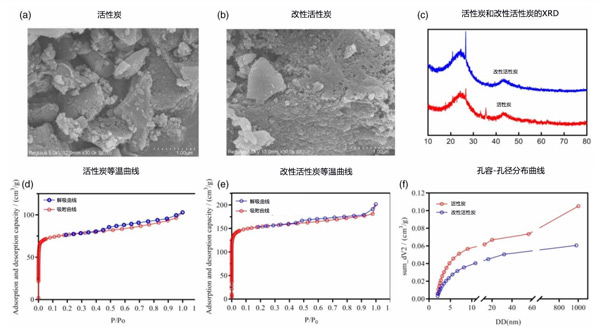 ¡¡¡¡µ±Ô»îÐÔÌ¿¾ÊÜ0.1mol/L¡¢0.5mol/LºÍ0.8mol/L¸ßÃÌËáÑΣ¬ìÑÉÕζÈΪ400¡æ¡¢500¡æ¡¢800¡æ£¬ìÑÉÕʱ¼äΪ2Сʱ£¬5СʱºÍ7Сʱ¡£Í¨¹ýÈýÒòËØÈýˮƽÕý½»ÊÔÑéºÍ¼«²î·ÖÎöɸѡ³ö¸ÄÐÔ»îÐÔÌ¿µÄºÏÊÊ×éºÏ¡£¸ÄÐÔºó¹Û²ìµ½»îÐÔÌ¿±íÃæÐÎ̬·¢ÉúÏÔ×ű仯£¬·Ö±ðÈçͼ1(b)Ëùʾ¡£¸ÄÐÔǰµÄ»îÐÔÌ¿±íÃæÓнϴóµÄÍžۿÅÁ££¬±íÃæÃ»ÓÐÃ÷ÏԵĿ×϶½á¹¹¡£¸ÄÐÔºó±íÃæ´Ö²Ú£¬³Ê²»¹æÔò͹ÆðµÄ´Ì×´¿ÅÁ£½á¹¹£¬¿×϶½á¹¹·¢´ï¡£¸ÄÐÔǰºó»îÐÔÌ¿µÄXRDͼÈçͼ1(c)Ëùʾ¡£»îÐÔÌ¿¸ÄÐÔǰºóµÄ·åÐÎÏàËÆ£¬µ«Ò»Ð©·å³öÏÖ£¬ÁíһЩ·åÏûʧ¡£Í¼1(d)ºÍ1(e)·Ö±ðÏÔʾÁË»îÐÔÌ¿¸ÄÐÔǰºóµÄÎü¸½ºÍ½âÎüµÈÎÂÏß¡£ËüÃÇÕûÌå³ÊËæP/P0Ôö¼ÓµÄÇ÷ÊÆ£¬Îü¸½Á¿Ôö¼Ó£¬µ«ÔÚÏàͬÇé¿öÏ£¬¸ÄÐÔ»îÐÔÌ¿µÄÎü¸½ÄÜÁ¦¸üÇ¿¡£Í¼1(f)Ϊ¸ÄÐÔǰºó»îÐÔÌ¿µÄ¿×Èݿ׾¶·Ö²¼£¬¸ÄÐÔºóµÄ»îÐÔÌ¿¿×Ìå»ý¸ü´ó¡£¸ÄÐÔ»îÐÔÌ¿µÄ±È±íÃæ»ýÊÇ»îÐÔÌ¿µÄÁ½±¶£¬ÀÛ»ýÎü¸½×Ü¿×Ìå»ýÊÇ»îÐÔÌ¿µÄ1.72±¶¡£