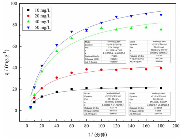 ¡¡¡¡¸ù¾Ý¶¯Á¦Ñ§·½³Ì£¬µ±Î¶ÈΪ25¡æÇÒ¸ÄÐÔ»îÐÔÌ¿ÓÃÁ¿Îª8g/Lʱ£¬ÄâÒ»¼¶¶¯Á¦Ñ§ºÍÄâ¶þ¼¶¶¯Á¦Ñ§·Ö±ðÓÃÓÚÄâºÏ¡£·¢ÏÖ¶þ½×¶¯Á¦Ñ§·½³ÌµÄÄâºÏЧ¹û¸üºÃ£¬½á¹ûÈçËùʾͼ2¡£