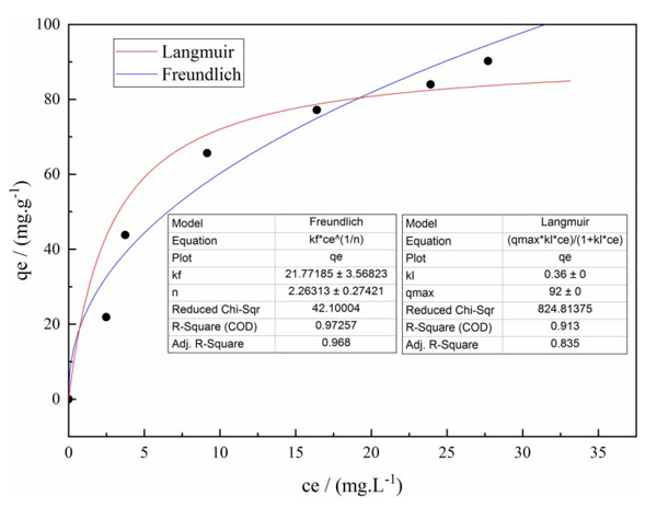 ¡¡¡¡µ±·´Ó¦Î¶ÈΪ25¡æ£¬Í¶¼ÓÁ¿Îª8g/Lʱ£¬¿É»ñµÃ²»Í¬³õʼŨ¶ÈÏÂÑÇÏõ»ù¶þÒÒ°·µÄƽºâŨ¶ÈºÍ¸ÄÐÔ»îÐÔÌ¿µÄƽºâÎü¸½ÈÝÁ¿¡£Ê¹ÓÃLangmuirºÍFreundlichÈÈÁ¦Ñ§·½³Ì¶ÔÊý¾Ý½øÐÐÄâºÏ£¬½á¹ûÈçËùʾͼ3´ÓͼÖпÉÒÔ¿´³ö£¬Îü¸½¹ý³Ì²»·ûºÏLangmuirµÈÎÂÏß·½³Ì£¬FreundlichÎü¸½µÈÎÂÏß·½³ÌÒ²ÊÊÓᣵ±³õʼŨ¶È´ïµ½Ò»¶¨ÖµÊ±£¬Îü¸½Ç÷ÓÚÆ½ºâ²¢´ïµ½±¥ºÍ¡£