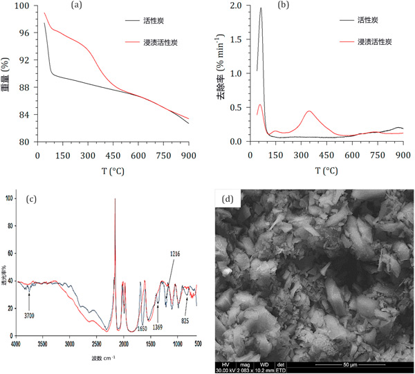 ¡¡¡¡Í¼1£º»îÐÔÌ¿ºÍ½þ×Õ»îÐÔÌ¿µÄÀí»¯ÌØÐÔ£º(a)ÈÈÖØ·ÖÎöÊ§ÖØÇúÏߣ¬(b)ÈÈÖØÊ§ÖØÂÊÇúÏߣ¬(c)FTIR¹âÆ×£¬(d)SEMÏÔ΢ÕÕÆ¬(½öÏÞ½þ×Õ»îÐÔÌ¿)¡£