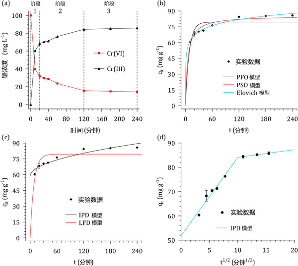 ¡¡¡¡Í¼2:(a)Áù¼Û¸õÈÜÒººÍ½þ×Õ»îÐÔÌ¿½Ó´¥Ê±¼ä¶ÔCrŨ¶ÈºÍÐÎ̬µÄÓ°Ïì¡£(b)·´Ó¦¶¯Á¦Ñ§Ä£ÐÍ¡¢(c)À©É¢Ä£ÐͺÍ(d)ÏßÐÔ»¯µÄ¿ÅÁ£ÄÚÀ©É¢Ä£ÐÍ¡£