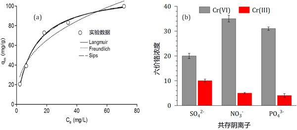 ¡¡¡¡Í¼3£º(a)½þ×Õ»îÐÔÌ¿Îü¸½Áù¼Û¸õµÄƽºâµÈÎÂÏߣ¬(b)¾ºÕùÒõÀë×Ó¶ÔÆ½ºâ¸õŨ¶ÈµÄÓ°Ïì¡£