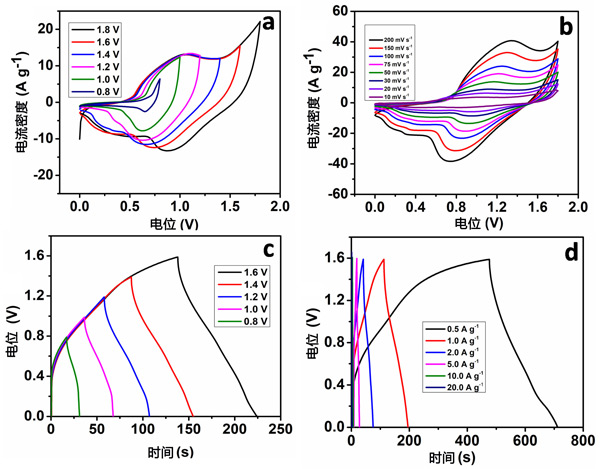 ¡¡¡¡³¬¼¶µçÈÝÆ÷×°ÖõÄÖÆÔìÊǼ¯³ÉÒõ¼«(Ñõ»¯Äø)£¬Ñô¼«(»îÐÔÌ¿)ʹÓÃÏËÎ¬ËØÂËÖ½(ÔÚ2.0M/KOHµç½âÒºÖнþÅÝ·ÅÖÃ)·ÖÀ룬ȻºóÓþøÔµ½º´ø°ü¹ü¡£Ñô¼«ºÍÒõ¼«¾ßÓÐÏàËÆµÄ¼¸ºÎ±íÃæ»ý£¬ÔÙ¾¹ýºÏÊʵÄÖØÁ¿±ÈÀ´ÖƳɵçÈÝÆ÷¡£Í¼2aÏÔʾÁ˳¬¼¶µçÈÝÆ÷¼þÔÚ¸÷ÖÖ½ØÖ¹ÇøÓòÖеÄCVÇúÏߣ¬É¨ÃèËÙÂÊΪ50mVs-1¡£´ÓͼÖпÉÒÔ¿´³ö£¬µçÈÝÆ÷¼þµÄCVÇúÏß³ÊÏÖ³öµäÐ͵Ä×¼¾ØÐεçÈÝÐÔÄÜ£¬Õâ¶ÔÓ¦ÓÚË«µç²ãµçÈÝÆ÷ºÍØÍµçÈݵÄÏ໥¹±Ïס£´ËÍ⣬µ±Ôö¼Ó¹¤×÷½ØÖ¹ÇøÊ±£¬»á·¢Éú¸ü¶àµÄ·¨ÀµÚµç»¯Ñ§·´Ó¦¡£µ±¹¤×÷µç볬¹ý1.7Vʱ£¬Ò²»áÔÚCVÇúÏßÉÏ×¢Òâµ½ÑõÆøµÄÊÍ·Å¡£»îÐÔÌ¿/Ñõ»¯ÄøÆ÷¼þºÜ´ó³Ì¶ÈÉÏÈ¡¾öÓÚ½ØÖ¹ÇøÓò¡£Òò´Ë£¬Ñ¡Ôñ1.6V×÷ÎªËæºóÑо¿³¬¼¶µçÈÝÆ÷¼þµç»¯Ñ§ÐÔÄܵÄDZÔÚ´°¿ÚÇøÓò¡£Í¼2bÏÔʾÁË»îÐÔÌ¿µçÈÝÆ÷¼þÔÚ0µ½1.6VµÄ½ØÖ¹ÇøÓòÄڵĸ÷ÖÖɨÃèËÙÂÊϵÄCVÇúÏß¡£µçÁ÷ÃܶÈËæ×ÅɨÃèËÙÂʵÄÔö¼Ó¶øÔö¼Ó£¬²¢ÇÒÑõ»¯·åµçÎ»×ªÒÆµ½¸üÕýµÄµç룬ÀàËÆÈýµç¼«Æ÷¼þµÄ½á¹û¡£