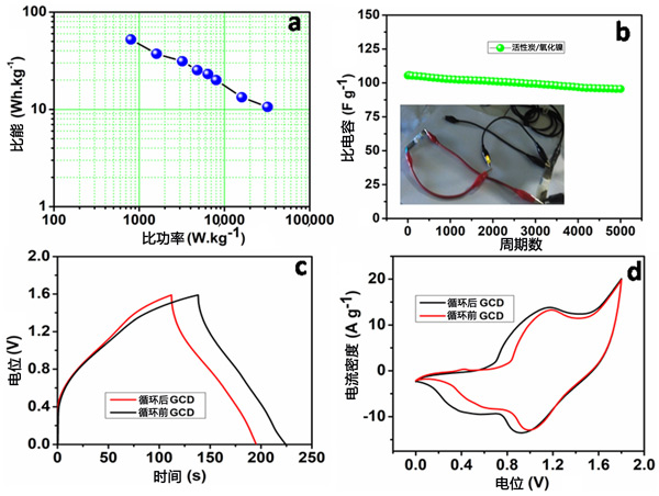 ¡¡¡¡RagoneͼÔÚͼ3aÏÔʾ¡£»îÐÔÌ¿µçÈÝÆ÷ÔÚ¹¦ÂÊÃܶÈΪ52.4ºÍ10.6Wh/kg-1ʱÏÔʾ³ö¸ßÄÜÁ¿ÃܶȷֱðΪ800ºÍ32,000W/kg-1¡£½Ó×Å£¬Ñо¿ÁË»îÐÔÌ¿ÐÂÐÍ´¢ÄÜÆ÷¼þÔÚ1Ag-1ϵÄÑ»·ÐÔÄÜ£¬ÔÚ0µ½1.6VµÄµçλ´°¿Ú·¶Î§ÄÚ½øÐÐÁ˳¬¹ý5000´ÎÑ»·£¬Èçͼ3bËùʾ¡£µçÈÝÆ÷µÄ±ÈµçÈÝÔÚ1Ag-1µÄ5000¸öºãµçÁ÷³ä·ÅµçÑ»·ÆÚ¼äÈÔ±£³Ö95.6Fg-1£¬Ô¼Îª³õʼµçÈݵÄ90.6%¡£¸ÃÆ÷¼þµÄºãµçÁ÷³ä·ÅµçÇúÏßÔÚ5000´ÎÑ»·ºóÈÔ±£³ÖÏàͬµÄ¶Ô³ÆÇúÏߣ¬±íÃ÷¸ÃÆ÷¼þÈÔ¾ßÓÐÁ¼ºÃµÄ¿ÉÄæµç»¯Ñ§»îÐÔ¡£ÓÉÓÚ»îÐÔÌ¿µçÈÝÆ÷¼þÔÚÑ»·¹ý³ÌÖÐÅ·Ä·µç×èµÄÔö¼Ó£¬±ÈµçÈÝÕýÔÚË¥¼õ¡£ÓÉÓÚÔÚ³ä·Åµç¹ý³ÌÖлîÐÔ²ÄÁÏÌå»ýµÄ±ä»¯£¬»îÐÔ²ÄÁϺͻù°åÖ®¼äµÄ½çÃæ½Ó´¥¿ÉÄÜ»áËæ×Åʱ¼äµÄÍÆÒÆ¶ø¶ñ»¯£¬´Ó¶øµ¼ÖÂÆ÷¼þµÄÅ·Ä·µç×è¸ü¸ß¡£´ËÍ⣬ÔÚÑ»·¹ý³ÌÖУ¬»îÐÔÌ¿²ÄÁÏ¿ÉÄÜ»á´Ó»ù°åÉÏÍÑÂ䣬´Ó¶øµ¼ÖµçÈݱ»µÍ¹À¡£Òò´Ë£¬±ØÐëÓÅ»¯µç¼«¹¹½¨·½·¨ÒÔÌá¸ßÆ÷¼þµÄ¿ÉÑ»·ÐÔ¡£Í¼3b´Ó¶øµ¼ÖÂÕâÖÖ»îÐÔÌ¿µçÈÝÆ÷¼þÔÚÏÂÒ»´ú´¢ÄÜÓ¦ÓÃÖеľ޴óDZÁ¦¡£Í¼3c¡¢d·Ö±ðÏÔʾÁ˵çÈÝÆ÷Æ÷¼þµÄÎȶ¨ÐÔÑо¿(5000´ÎÑ»·ºó)֮ǰºÍÖ®ºóµÄºãµçÁ÷³ä·ÅµçÇúÏߺÍCVÇúÏß¡£ÓÉ»îÐÔÌ¿ÖÆ³ÉµÄÐÂÐÍ´¢ÄܲúÆ·µÄ±ÈµçÈÝÔÚ5000´ÎºãµçÁ÷³ä·ÅµçÑ»·ºóÈÔ±£³Ö³õʼµçÈݵÄÔ¼90%¡£