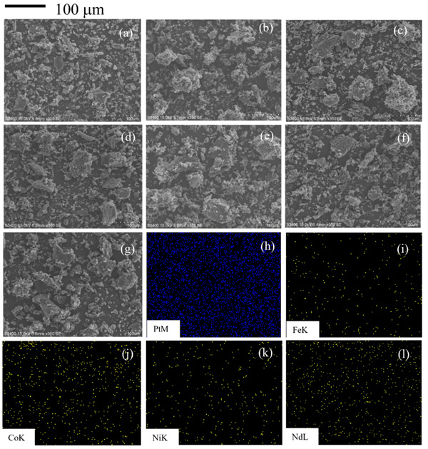 ¡¡¡¡Í¼1£º(a)ÔØ²¬»îÐÔÌ¿,(b)ÔØÌú²¬»îÐÔÌ¿,(c)ÔØ´ÅÌú,(d)ÔØ´ÅÌú²¬,(e)ÔØîܲ¬,(f)ÔØÄø²¬µÄSEMÕÕÆ¬ºÍ(g)ÔØîϲ¬»îÐÔÌ¿´ß»¯¼ÁÒÔ¼°(h)²¬¡¢(i)Ìú¡¢(j)îÜ¡¢(k)ÄøºÍ(l)îÏÔÚ»îÐÔÌ¿ÉϵÄÏàÓ¦ÔªËØÓ³ÉäͼÏñ¡£