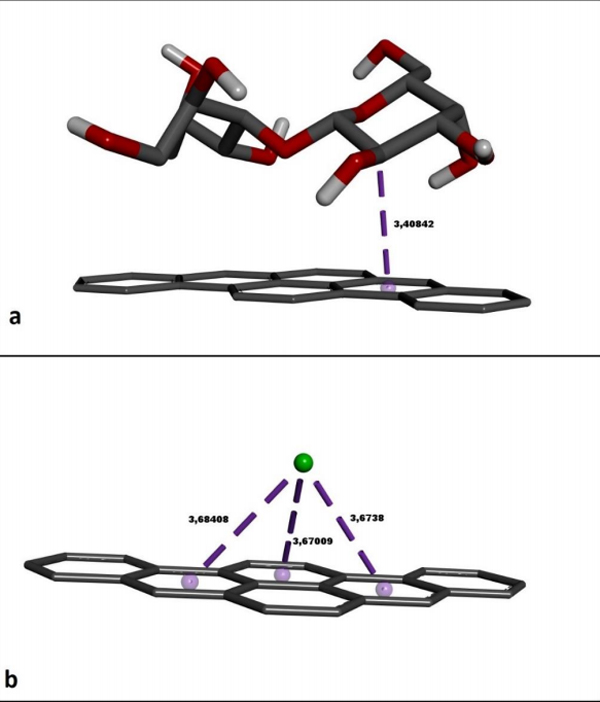 ¡¡¡¡ÔÚÕâÏîÑо¿ÖУ¬½øÐÐÁË·Ö×Ó¶Ô½ÓÒÔ¼ì²é»îÐÔÌ¿ÓëÈéÌÇÒÔ¼°Àë×Ó£º¸ÆµÄÔ×Ó¼äÏ໥×÷Óá£Èçͼ2aËùʾ£¬ÈéÌÇ·Ö×ÓÔÚÆä½á¹¹ÖеÄßÁà«°ëÈéÌÇ»·µÄµÚÈý¸ö̼Ô×ÓÉÏÓë»îÐÔ̼µÄÁù½Ç̼»·ÐγÉÒ»¸öÊèË®π-σ½Ó´¥¡£ËäÈ»ÕâÖַǼüºÏ½Ó´¥µÄ³¤¶ÈΪ3.40Å£¬µ«ÈéÌÇÓë»îÐÔÌ¿µÄ½áºÏ×ÔÓÉÄÜÊÇÓÐÀûµÄ¡£¸Æ(Ca+2)Àë×ÓÓëÈý¸öÏàÁڵĻîÐÔÌ¿Áù½Ç̼»·ÐγÉÈý¸ö¼üÏ໥×÷ÓÃ(ͼ2b)¡£