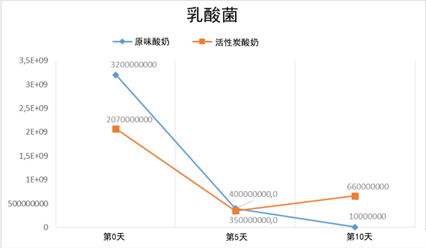 ¡¡¡¡Í¼3£ºÔζËáÄ̺ͺ¬»îÐÔÌ¿ËáÄ̵Ä×ÜÈéËá¾ú(cfu/gr£º¾úÂäÐγɵ¥Î»)ÌìÊý¡£