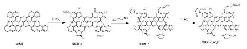 ¡¡¡¡ÒÔ»îÐÔ̿ΪÔÁÏ£¬ÓÃHNO3Ñõ»¯£¬ÓÃÒÒ¶þ°·°·»¯¡£µÃµ½µÄÖмäÌåÓÃÁòËáË®ÈÜÒº´¦ÀíÒÔ²úÉúÁòËáÇâ»îÐÔÌ¿´ß»¯¼Á¡£Í¨¹ý¹ýÂË·ÖÀë²úÎï²¢ÔÚ105¡æ¸ÉÔï24Сʱ¡£»îÐÔÌ¿µÄ¾ßÌåÖÆ±¸·½°¸Èçͼ1Ëùʾ¡£