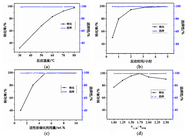 ¡¡¡¡Í¼2£º·´Ó¦Ìõ¼þ¶Ô±½¼×ȩת»¯ÂʵÄÓ°Ïì¡£(a)·´Ó¦Î¶ȡ¢(b)·´Ó¦Ê±¼ä¡¢(c)´ß»¯¼ÁÓÃÁ¿¡¢(d)ÒÒ¶þ´¼/±½¼×È©µÄĦ¶û±È¡£