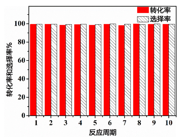 ¡¡¡¡×îºóͨ¹ý»ØÊÕʵÑé²âÊÔÁË»îÐÔÌ¿´ß»¯¼ÁµÄÎȶ¨ÐÔ£¬²âÊÔ½á¹ûÈçͼ3Ëùʾ¡£ÔÚ´ß»¯¼Á¿ÉÖØ¸´Ê¹ÓÃÐÔÄܵÄ̽Ë÷ÖУ¬»îÐÔÌ¿´ß»¯¼ÁÓÃÈܼÁ»·¼ºÍéÏ´µÓ£¬È»ºó½øÈëÏÂÒ»¸ö·´Ó¦Ñ»·¡£¾ßÌå¹ý³ÌΪ½«·´Ó¦Íê³ÉºóµÄ¹ÌÌåÀëÐÄ·ÖÀë³öÀ´£¬ÔÙÓû·¼ºÍéÏ´µÓ¹ÌÌå3´Î£¬ÒÔÍêȫȥ³ýǰһÂÖ·´Ó¦±íÃæ²ÐÁôµÄÉÙÁ¿ÒºÌå¡£¼´Ê¹ÔÚÁ¬ÐøÔËÐÐ10´Îºó£¬´ß»¯¼ÁµÄÐÔÄÜҲûÓÐÏÔ׎µµÍ£¬ÈÔÈ»´ïµ½99%µÄ±½¼×ȩת»¯ÂʺÍ99%µÄÑ¡ÔñÐÔ¡£Òò´Ë£¬»îÐÔÌ¿´ß»¯¼ÁÊÇÓÃÓÚÑо¿±½¼×È©ÒÒ¶þ´¼ËõÈ©·´Ó¦µÄÓÅÒìÇÒÎȶ¨µÄ¿É»ØÊÕ¹ÌÌåËá´ß»¯¼Á¡£