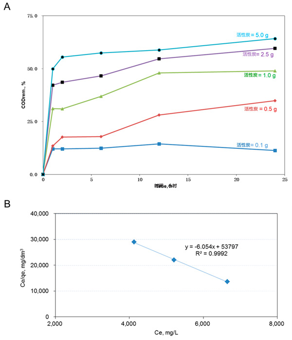 ¡¡¡¡Í¼1:ʹÓùýµÄ»îÐÔÌ¿µÄÎü¸½ÌØÐÔ¡£(A)È¥³ýµÄCOD°Ù·Ö±ÈÓëÓÃÓÚÎü¸½È¾É«·ÏË®CODµÄ»îÐÔÌ¿Á¿µÄ¹ØÏµÍ¼¡£(B)Ce/qe±ÈÂÊÓëCeµÄ¹ØÏµÍ¼¡£