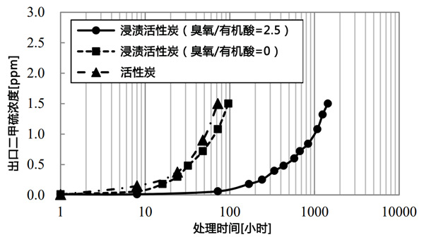 当吸附剂为活性炭和2.5臭氧/有机酸的浸渍活性炭时,进行了动态吸附实验。图3显示了动态吸附实验中出口二甲硫浓度的时间变化,浸渍活性炭在2.5臭氧/有机酸下的吸附能力是活性炭的15倍。这些结果表明浸渍的活性炭可以作为臭氧氧化的催化剂。吸附速率常数不会因改变臭氧/有机酸而改变。这些结果表明,有机酸氧化不影响吸附速率。通过比较浸渍活性炭在臭氧和有机酸下的结果,可以看出浸渍活性炭的吸附能力高于活性炭。这是由于二甲硫被碘酸氧化。浸渍活性炭的吸附速率常数与活性炭的吸附速率常数几乎相同。该结果表明浸渍不受流体膜或细孔扩散速率的影响。