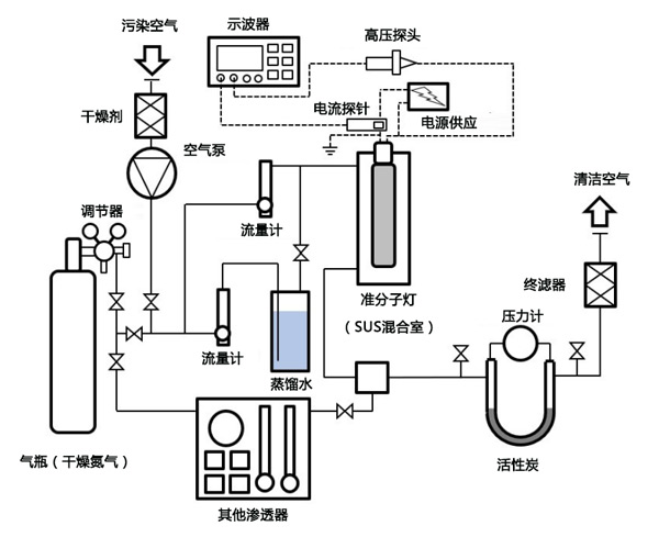 使用动态吸附实验进行臭氧催化氧化的表征。动态吸附的实验装置如图2所示。臭氧气体和二甲硫气体的混合物流入浸渍的活性炭。通过驱动准分子灯产生臭氧,2.1L/分钟的室内空气流入SUS室。臭氧浓度由放电功率控制。二甲硫是通过将0.2L/分钟的干燥空气流到气体渗透器而产生的。使用气体检测管测量出口二甲硫浓度,测定了突破时间对臭氧添加量的依赖性,并研究了臭氧量优化。