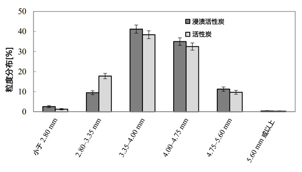 在一系列实验中使用了用碘酸和无机酸浸渍的颗粒活性炭。根据测量粒度分布、堆积密度和甲苯吸附能力,和测量浸渍活性炭的pH值。粒度按筛子大小分类。通过测量包装在200mL容器中的浸渍活性炭的重量来计算堆积密度。通过将1/10甲苯蒸气流到10g浸渍活性炭中,测量甲苯蒸气吸附前后的重量差,计算出甲苯吸附容量。将3g浸渍活性炭加入300mL离子交换水中并摇动30分钟,制成活性炭样品再进行pH测量。图1显示了浸渍活性炭和活性炭的粒度分布。对于浸渍活性炭和活性炭,粒径均为2.80-5.60毫米。这些粒径通常是气体处理的值。通过浸渍,堆积密度增加,甲苯吸附能力降低。这可能是由于浸渍材料渗入了孔隙。由于金属的杂质,活性炭的pH值呈碱性。由于酸解离,通过浸渍降低了pH值。