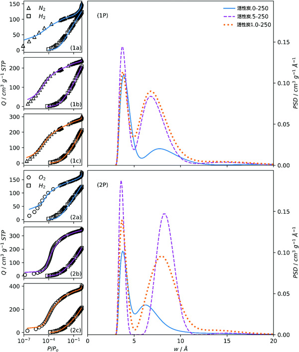 图2:拟合样品活性炭的N2/H2(1a,1b,1c)和O2/H2(2a,2b,2c)等温线和所得的PSD(1P,2P)。