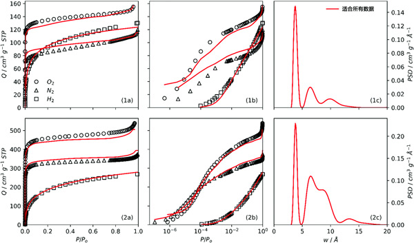 图3:使用线性(1a,2a)和对数(1b)中的x轴同时拟合活性炭0-300(1a,1b)和活性炭1(2a,2b)的O2、N2和H2等温线)尺度,以及从三向拟合(1c,2c)确定的PSD。