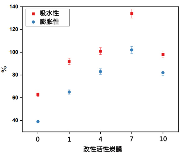 ¡¡¡¡¶ÔÓÚË®´¦ÀíÓ¦Óã¬WUºÍÈÜÕÍÊÇĤÑо¿µÄÖØÒª²ÎÊý£¬ÒòΪËüÃÇÖ¸¶¨Á˹ýÂËÐÔÄܺÍÉú²úÂÊ¡£ÕâÁ½¸öÌØÐÔÓëĤ±íÃæÉÏÇ×Ë®³É·ÖºÍ¹ÙÄÜÍŵĴæÔÚÃÜÇÐÏà¹Ø¡£Í¼3ÏÔʾÁËÖÆÔìĤµÄWUºÍÈÜÕͰٷֱȡ£ÔʼĤ±íÏÖ³ö·Ç³£ÉÙµÄWUºÍÈÜÕͰٷֱȣ¬±íÃ÷¾ÛÃÑí¿µÄÊèË®ÐÔ¡£Óë½Ó´¥½ÇºÍSEM½á¹ûÒ»ÖÂ;±íÃ÷¾ÛÃÑí¿Ä¤µÄ¸ß½Ó´¥½ÇºÍ±¡µÄ²»¶Ô³Æ¶¥²ãµ¼Ö½ÏÉÙµÄWUºÍÈÜÕÍÄÜÁ¦¡£ÓÉÓÚÌí¼ÓÁËÇ×Ë®ÐÔ¸ÄÐÔ»îÐÔÌ¿£¬ÓëÔʼĤÏà±È£¬¸ÄÐÔĤÏÔʾ³ö¸üºÃµÄ½á¹û¡£ÓÉÓÚ¸ÄÐÔ»îÐÔÌ¿µÄÇ×Ë®ÐԺ͸߶ȶà¿×½á¹¹£¬Ëü¶ÔWUºÍĤµÄÈÜÕͰٷֱȾßÓлý¼«Ó°Ïì¡£Ïà¶ÔÓÚÆä¸ÉÔï״̬£¬µ±¸ÄÐÔ»îÐÔÌ¿µÄÁ¿Ôö¼Óµ½7%(ÓëÔʼ״̬Ïà±ÈÊÇÔʼ״̬µÄ2±¶)ʱ£¬ÎüË®ºÍÅòÕ͵İٷֱÈÔö¼Ó%Öµ¿ªÊ¼Ï½µ¡£¿×Ìå»ýÔÚĤµÄÎüË®ÄÜÁ¦ÖÐÒ²Æð׏ؼü×÷Óã¬ÒòΪ¿×Ìå»ýÔö¼ÓÁËÎüË®ÂÊ£¬ÅòÕͰٷֱÈÒ²Ôö¼ÓÁË¡£ÓÉÓÚ»îÐÔ̿Ĥ7¾ßÓÐ×î¸ßµÄ±È±íÃæ»ýºÍ¿×ÈÝ£¬Òò´Ë¶ÔË®·Ö×ÓµÄÎüÊÕÄÜÁ¦¸üÇ¿£¬·ÀÎÛÐÔÄܸüºÃ¡£Ëæ×ÅĤÖиÄÐÔ»îÐÔ̿Ũ¶ÈµÄÔö¼Ó£¬¹Û²ìµ½ÉøÍ¸Ë®Í¨Á¿Ïà¶ÔÓÚÔʼĤÔö¼ÓÁ˸ߴï7%µÄ»îÐÔ̿Ũ¶È¡£È»¶ø£¬ÔÚ¸ü¸ßµÄ»îÐÔ̿Ũ¶ÈÏ£¬¼´³¬¹ý7%£¬Ë®Í¨Á¿Ï½µ¡£