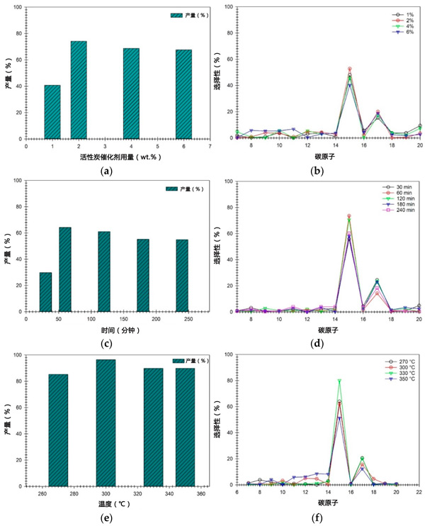 ¡¡¡¡»îÐÔÌ¿´ß»¯¼Á¸ºÔضÔÌþÀàת»¯ºÍ²úÎï·Ö»¯µÄÓ°ÏìÈçͼ3a¡¢bËùʾ¡£ÍÑÑõ·´Ó¦ÔÚ¶èÐÔN2Æø·ÕÖÐÔÚ300¡æµÄ·´Ó¦Î¶ȺÍ500rpmµÄ½Á°èËÙ¶ÈϽøÐÐ30·ÖÖÓ¡£ÆÀ¹ÀÁË´ß»¯¼Á¸ºÔØÁ¿(¼´1-6wt.%)µÄÓ°Ïì¡£Êý¾Ý±íÃ÷£¬ÍÑÑõÐÔÄܺͷֻ¯¾ùÔÚ1-2wt.%µÄ»îÐÔÌ¿´ß»¯¼Á¸ºÔØ·¶Î§ÄÚÉý¸ß£¬µ«ËæºóÔÚ´ß»¯¼Á¸ºÔØ>2wt.%ºóϽµ¡£²úÂʺͲúÎïÑ¡ÔñÐÔµ±Ê¹ÓÃ2wt.%ʱ£¬ÆäЧ¹û¸üºÃ£¬¼´·Ö±ðΪ47.13%ºÍ72.85%¡£Ïà·´£¬ÔÚ´ß»¯¼Á¸ºÔØÁ¿³¬¹ý2wt.%ʱ£¬ÍÑÑõÐÔÄܺÍÑ¡ÔñÐÔµÄϽµ¿ÉÄÜ·´Ó³ÁË´ß»¯¼ÁµÄ¸ºÔعýÖØ£¬ÓÉÓÚ²»Í¬µÄ»îÐÔλµãµÄÊ£Óà»îÐÔλµã£¬Õ⽫´Ù½ø¶Ô¶þ¼¶ºÍ²¢Ðз´Ó¦µÄÇý¶¯¡£
