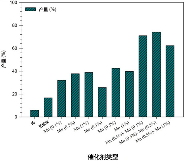 ¡¡¡¡µ±·ÏÓͶÔMn/»îÐÔÌ¿ºÍMn-Mo/»îÐÔÌ¿´ß»¯¼ÁÑùÆ·½øÐÐÍÑÑõ·´Ó¦Ê±£¬²úÎï°üÀ¨ÒºÌ¬ÕýÍéÌþºÍÏ©Ìþ£¬ÒÔ¼°º¬ÑõÖмäÌåÎïÖÊ£¬ÀýÈç´¼£¬È©ºÍͪ£¬ÒÔ¼°Æû»¯µÄCOºÍCO2¡£µ¥¶À»òÁ½ÖÖ»îÐÔÌ¿½ðÊô´ß»¯¼ÁÉú²úÌṩÁËÓÅÒìµÄת»¯ºÍÍêÈ«²îÒ컯ÔÚ·ÏÓ͵ÄÈܽâÑõ¹ý³Ì¡£»îÐÔÌ¿´ß»¯¼ÁµÄ·´Ó¦ÐÔÄÜÖ÷Ҫȡ¾öÓÚMnºÍMo±íÃæÃܶÈÒÔ¼°´ß»¯¼ÁµÄËá¶È¡£ÍÑÑõ·´Ó¦ÔÚ300¡æµÄ·´Ó¦Î¶ȺÍ500rpmµÄ½Á°èËÙ¶ÈÏÂÔÚ¶èÐÔN2ÖнøÐÐ30·ÖÖÓÆø·Õ¡£¶Ô»îÐÔÌ¿ÉÏMnºÍMo¸ºÔذٷֱȵÄɸѡ±íÃ÷£¬Óë0.1wt.%Ïà±È£¬½«»îÐÔÌ¿¸ºÔØ0.5wt.%½«Ìþ²úÂÊ´Ó31.9%Ìá¸ßµ½37.9%£¬²¢½«Mo¸ºÔØÁ¿´Ó0.1wt.%Ìá¸ßÖÁ0.5wt.%µ¼Ö²úÂÊ´Ó25.7%Ôö¼Óµ½42.4%¡£É¸Ñ¡½á¹û±íÃ÷£¬×î¼ÑµÄÃ̸ºÔذٷֱÈΪ0.5wt.%£¬²¢Ñ¡ÔñÁ˴˰ٷֱȡ£Mo¶ÔMn´ß»¯¼ÁµÄÓ°Ïì´Ó0.1µ½1wt.%¸ºÔذٷֱȽøÐÐÁËÑо¿£¬½á¹û±íÃ÷0.5wt.%µÄMnºÍMoÊǺÏÊʰٷֱȣ¬ÌþÊÕÂÊΪ74%(ͼ2)¡£