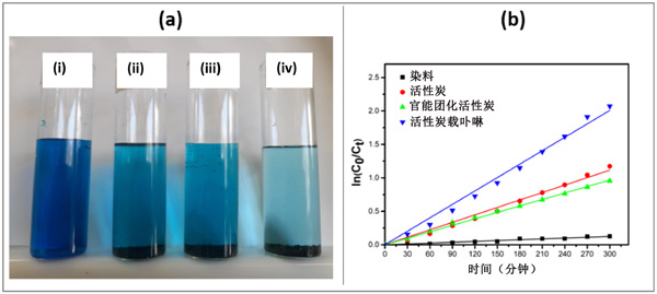 ¡¡¡¡Í¼3£º(a)¹ýÂ˿ɼû¹âÕÕÉä5СʱºóMBÈÜÒºµÄÕÕÆ¬¡£(i)µ¥¶ÀµÄMB£¬(ii)MBÓë»îÐÔÌ¿£¬(iii)MBÓë¹ÙÄÜÍÅ»¯»îÐÔÌ¿£¬ºÍ(iv)MBÓë»îÐÔÌ¿ÔØß²ßø£¬(b)ÑǼ×À¶½µ½âµÄ¶¯Á¦Ñ§ÏßÐÔÄ£ÄâÇúÏß¡£
