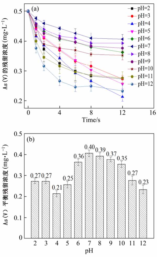 ¡¡¡¡Í¼2£ºpH¶ÔAs(V)µçÎü¸½µÄÓ°Ïì(a)As(V)µÄ²ÐÁôŨ¶È£¬(b)As(V)µÄƽºâŨ¶È¡£