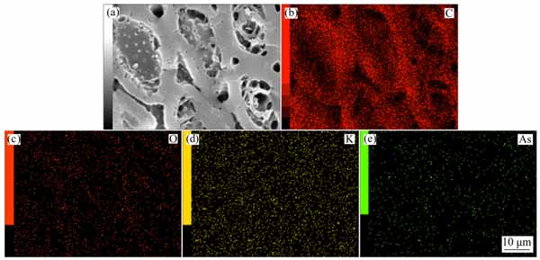 ¡¡¡¡Í¼3£º»îÐÔÌ¿µç¼«As(V)µçÎü¸½ºóµÄSEMÏñ(a)ºÍÔªËØ·Ö²¼(b-e)¡£