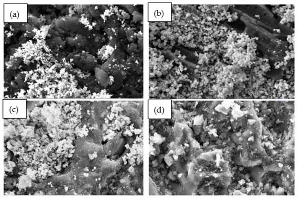 图1:活性炭双金属浸渍吸附剂的SEM形态图像,比例放大2.5Kx(2μm)。(a)ZnAc2/ZnO/活性炭,(b)ZnAc2/KOH/活性炭,(c)ZnAc2/TiO2/活性炭,(d)ZnAc2/活性炭。