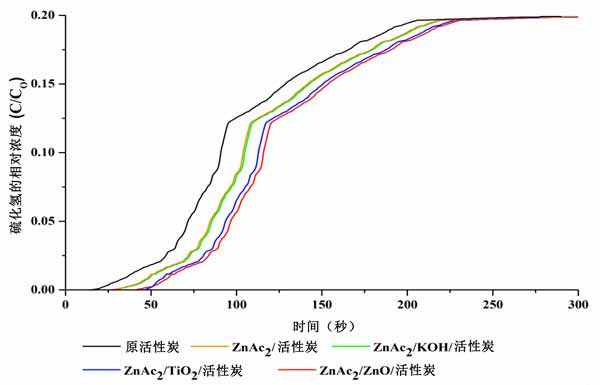 通过选择合成吸附剂对硫化氢气体的吸附效果产生了如图3所示的吸附曲线。这些吸附曲线也与使用浸渍活性炭和原活性炭实现的吸附进行了比较。我们发现吸附趋势呈指数增长,形成S曲线。突破时间被确定为硫化氢浓度达到1ppm(突破浓度)和饱和浓度达到几乎5000ppm的值所用的时间。与其他双金属活性炭吸附剂相比,ZnAc2/ZnO/活性炭吸附剂的吸附表现出优异的性能。双金属活性炭吸附剂的合成表现出良好的性能,与ZnAc2/活性炭和原活性炭相比,硫化氢的吸附增加了30.2-45.8%和85.9-89.1%。因此,采用这种浸渍方法的活性炭表现出的高吸附增强了硫化氢吸附能力。