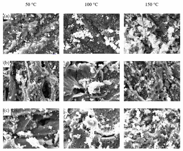 图4:(a)ZnAc2/ZnO/活性炭、(b)ZnAc2/活性炭和(c)原活性炭吸附剂在不同解吸温度下的2.5Kx放大倍率和2微米尺度的SEM显微照片。