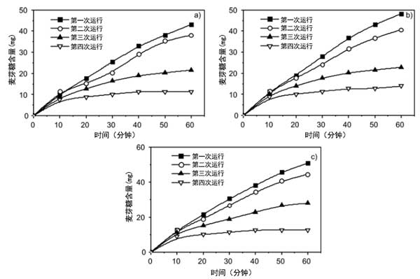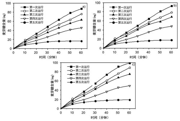 ¡¡¡¡¹Ì¶¨»¯α-µí·Ûøˮ½âµí·ÛÔÚÏàͬ»îÐÔÌ¿ÉϵÄα-µí·Ûøˮ½âµÄÂóÑ¿ÌǵÄÁ¿Óëµí·ÛŨ¶ÈÎ޹ء£ÂóÑ¿ÌÇÒ²±»α-µí·Ûøˮ½â£º½á¹û±íÃ÷£¬Èç¹û¹Ì¶¨·¢ÉúÔÚÏàͬµÄ»îÐÔÌ¿ÉÏ£¬ÔòË®½âÂóÑ¿ÌǺÍË®½âµí·ÛµÄÁ¿±£³Ö²»±ä¡£Õâ±íÃ÷µí·ÛŨ¶ÈÊÇ×ã¹»µÄ¡£¹Ì¶¨ÔÚACFÉϵĵí·ÛøµÄÁ¿Ô½´ó£¬Ë®½âÂóÑ¿ÌǵÄÁ¿¾ÍÔ½¸ß¡£¶ÔÓÚ»îÐÔÌ¿-0£¬µÚÒ»´ÎÔËÐÐ60·ÖÖÓºóË®½âÂóÑ¿ÌǵÄÁ¿Îª20mg¡£µÚ¶þÂÖϽµµ½12ºÁ¿Ë£¬µÚÈýÂÖϽµµ½8ºÁ¿Ë¡£¶ÔÓÚ»îÐÔÌ¿¸ÄÐÔÏËά£¬µÚÒ»´ÎÔËÐÐ60·ÖÖÓºóË®½âÂóÑ¿ÌǵÄÁ¿Îª100mg¡£Îü¸½µÄµí·ÛøÔÚÔËÐÐ3´ÎºóÈÔ±£³Ö½Ï¸ßµÄË®½â»îÐÔ¡£µÚËÄ´ÎÔËÐкóÆä»îÐÔϽµ£¬ÂóÑ¿ÌÇÁ¿Îª50ºÁ¿Ë¡£¶ÔÓÚ»îÐÔÌ¿£¬µÚÒ»´ÎÔËÐÐ60·ÖÖÓºóË®½âÂóÑ¿ÌǵÄÁ¿Îª50mg¡£Îü¸½µÄµí·ÛøÔÚÁ½´ÎÔËÐк󱣳ֽϸߵÄË®½â»îÐÔ¡£3´ÎÔËÐкóÆä»îÐÔ½µµÍ£¬ÂóÑ¿ÌÇÁ¿Îª20mg¡£¹Ì¶¨»¯Ã¸×îÖØÒªµÄÓŵãÊÇËüµÄ¿ÉÖØ¸´Ê¹ÓÃÐÔ¡£»îÐÔÌ¿ÏËάµÄ±íÃæ»ùÍÅÒ²Ó°Ïìα-µí·ÛøµÄ½âÎüÐÐΪ¡£¹Ì¶¨ÔÚ»îÐÔÌ¿-0ÉϵÄα-µí·ÛøÔÚË®½â¹ý³ÌÖд󲿷ֻᱻ½âÎü£¬2´ÎÔËÐкó¹Ì¶¨ÔÚ»îÐÔÌ¿-0ÉϵÄα-µí·ÛøµÄ±£Áô»îÐÔΪ10%¡£È»¶ø£¬¹Ì¶¨ÔÚ¸ÄÐÔ»îÐÔÌ¿ºÍ»îÐÔÌ¿-HNO3ÉϵÄα-µí·ÛøÔÚ4´ÎÔËÐкó±íÏÖ³ö³¬¹ý24%ºÍ14%µÄ»îÐÔ¡£