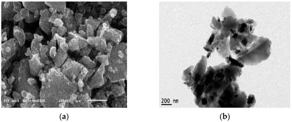 ¡¡¡¡Í¼1£º(a)SEMÏÔ΢ÕÕÆ¬£¬(b)»îÐÔÌ¿ÄÉÃ×Á£×ÓµÄTEMÏÔ΢ÕÕÆ¬¡£