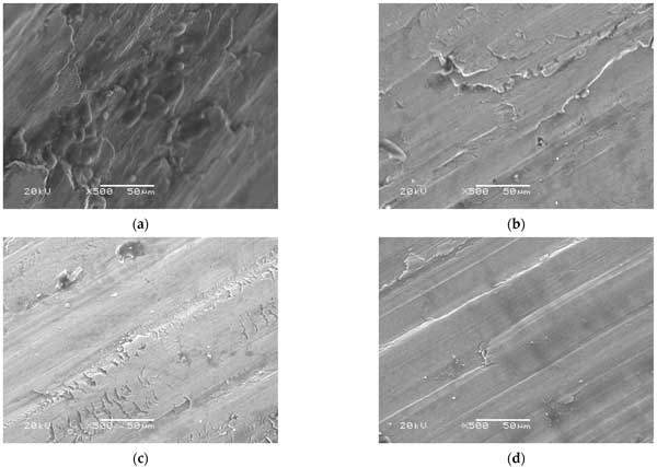 ¡¡¡¡Í¨¹ý¹Û²ìĦ²Áѧ²âÊԵĽá¹û£¬ºÜÃ÷ÏÔÆ½¾ùÄ¥ºÛÖ±¾¶ºÍÖÊÁ¿ËðʧµÄ¼õÉÙ½á¹û¾ßÓÐÏàËÆµÄÇ÷ÊÆ¡£È»¶ø£¬µ±½«»îÐÔÌ¿Ìí¼Óµ½Èó»¬Ö¬ÖÐʱ£¬ÖÊÁ¿ËðʧֵÏÔʾ³ö¸ü¶¸Ç͵ÄÇ÷ÊÆ¡£ÎªÁ˽øÒ»²½Á˽âÖÊÁ¿Ëðʧ½á¹ûÒÔ¼°±íÃæµÄÄ¥ºÛÐÎò£¬Ó¦ÓÃÁËÓëÄÜÁ¿É«É¢XÉäÏß(EDX)ϵͳ¼¯³ÉµÄSEM¡£²âÊÔÆø¸×Ä¥ºÛµÄEDX¹âÆ×ÊÇÕë¶Ô·Å´ó500±¶µÄSEMͼÏñÈ·¶¨µÄ£¬ÒÔ±ã´ÓÄ¥ºÛµÄ±íÃæ¹ì¼£ÖлñµÃ¹ØÓÚ½Ó´¥±íÃæÉϵÄĦ²ÁĤµÄ³ÁµíÔªËØ(̼ºÍÑõ)µÄ±ØÒªÐÅÏ¢¡£Í¼3ÏÔʾÁËÒÔ500±¶·Å´ó±¶ÂʳÉÏñʱµÄÄ¥Ëð±íÃæÐÎ̬¡£ÔÚ¾ßÓдֲڱíÃæÐÎ̬µÄÉÌÒµÓÍÖ¬ÑùÆ·µÄÇé¿öÏ£¬Í¼ÏñÃè»æÁËdz²ÛºÍÉî²Û(ͼ3a)¡£ÁíÒ»·½Ã棬»îÐÔÌ¿ÑùÆ·ºÍ2wt.%ÆäËûÑùÆ·µÄÄ¥Ëð±íÃæ(ͼ3b£¬c)ÏÔʾ³ödz²Û£¬´øÓÐÉÙÁ¿Éî²ÛµãºÍ¹â»¬µÄÐÎò£¬¶øÔÚ0.5wt.%»îÐÔÌ¿+2wt.%ÆäËûÑùÆ·µÄ»ìºÏÑùÆ·½öÏÔʾ³ö±¡²Û(ͼ3d)¡£