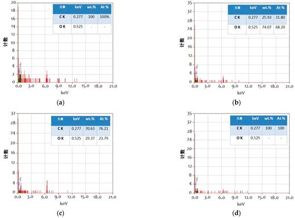 ¡¡¡¡Í¼4£º²âÊÔÑùÆ·ÔÚ500±¶·Å´óÂÊϵÄSEMÄ¥ºÛͼÏñµÄEDX¹âÆ×(a)ï®»ùÈó»¬Ö¬£¬(b)1wt.%»îÐÔÌ¿£¬(c)2wt.%ÆäËûÑùÆ·£¬ºÍ(d)0.5wt.%»îÐÔÌ¿+2wt.%ÆäËûÑùÆ·¡£