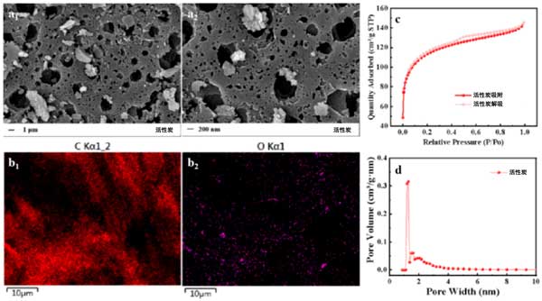 ¡¡¡¡Í¼1£º»îÐÔÌ¿µÄSEM(a1,a2)¡¢EDS(b1,b2)¡¢N2Îü¸½-ÍѸ½µÈÎÂÏß(c)ºÍ¿×¾¶·Ö²¼(d)ͼÏñ¡£