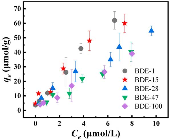 ¡¡¡¡ÔÚʵ¼ÊÎÛȾ³¡µØ£¬Í¨³£´æÔÚ¸÷ÖÖPBDEs£¬½øÒ»²½Ñо¿ÁË»îÐÔÌ¿ÔÚÏ´ÍÑÒºÖжԲ»Í¬PBDEsµÄÎü¸½ÌØÐÔ¡£»îÐÔÌ¿¶Ô²»Í¬PBDEsµÄÎü¸½Ð§¹ûÈçͼ2Ëùʾ¡£½á¹û±íÃ÷£¬»îÐÔÌ¿¶ÔÎåÖÖPBDEs¾ßÓÐÁ¼ºÃµÄÎü¸½Ð§¹û¡£Ëæ×ÅPBDEsÖÐä庬Á¿µÄÔö¼Ó£¬»îÐÔÌ¿¶ÔPBDEsµÄÎü¸½ÄÜÁ¦½µµÍ;Õâ¿ÉÄÜÊÇÒòΪµÍäå¶àäå¶þ±½ÃÑ·Ö×ÓÌå»ý½ÏС£¬¸üÈÝÒ×ÓëÎü¸½¼ÁµÄÎü¸½Î»µã½áºÏ¡£×ÛÉÏËùÊö£¬»îÐÔÌ¿¶Ô²»Í¬ä廯¶ÈµÄPBDEs±íÏÖ³öÁ¼ºÃµÄÈ¥³ýÄÜÁ¦¡£