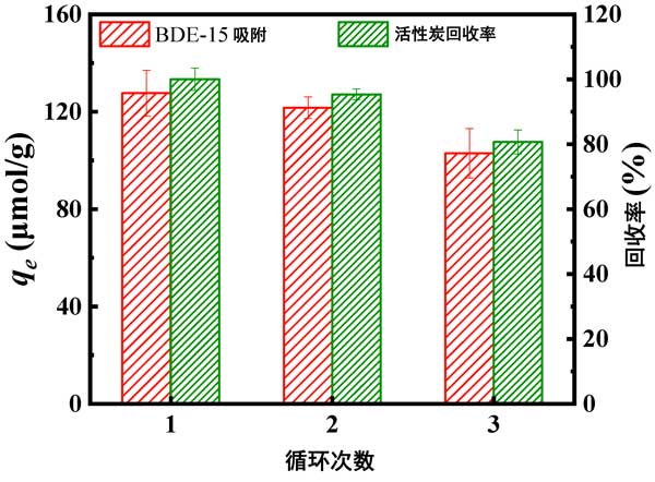 ¡¡¡¡ÎªÑо¿»îÐÔÌ¿´¦ÀíÏ´ÍÑÒººóµÄÑ»·ÀûÓÃÐÔÄÜ£¬²ÉÓü״¼Ï´ÍÑ»îÐÔÌ¿½øÐÐÔÙÉú»ØÓá£Èçͼ3Ëùʾ£¬ÔÚÈý¸ö»ØÊÕ-Îü¸½Ñ»·ÖУ¬»îÐÔÌ¿µÄÎü¸½Á¿ÂÔÓÐϽµ£¬»îÐÔÌ¿µÄÎü¸½Á¿±£³ÖÔÚ103μmol/gÒÔÉÏ£¬Ï½µÁË25μmol/g(ϽµÁË19%)¡£»îÐÔÌ¿±íÏÖ³öÁ¼ºÃµÄ¿É»ØÊÕÐԺͿÉÖØ¸´Ê¹ÓÃÐÔ£¬ÓÐÀûÓÚʵ¼ÊÓ¦Óá£