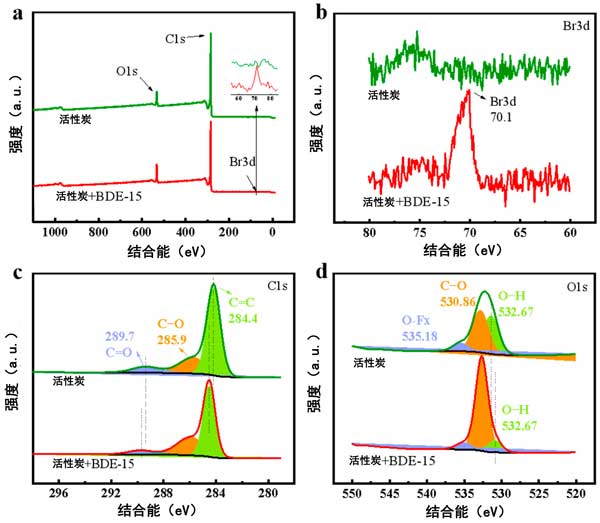 ¡¡¡¡Îü¸½ÊDZ»Îü¸½µÄÎÛȾÎïÓë²ÄÁϱíÃæÖ®¼äµÄ½çÃæ¹ý³Ì¡£ÎªÁË̽Ë÷Îü¸½»úÀí£¬Ê×ÏÈÓÃXPSÑо¿ÁË»îÐÔÌ¿Îü¸½4,4-¶þäå¶þ±½ÃÑ(BDE-15)ºó±íÃæ»¯Ñ§½á¹¹µÄ±ä»¯¡£Èçͼ4aËùʾ£¬»îÐÔÌ¿ÖеÄÖ÷ÒªÔªËØÎªCºÍO£¬Îü¸½Ç°ºóC1sºÍO1sµÄ·åλÎÞÃ÷ÏԱ仯£¬ËµÃ÷Îü¸½Ç°ºó»îÐÔÌ¿µÄ»¯Ñ§³É·ÖºÍ½á¹¹»ù±¾Ò»Ö¡£Ïàͬ¡£»îÐÔÌ¿ÁÜÏ´Òº´¦Àíºó£¬×ÜÆ×ͼÖгöÏÖBrÔªËØ·å(ͼ4b)£¬±íÃ÷BDE-15³É¹¦Îü¸½ÔÚ»îÐÔÌ¿ÉÏ¡£Îü¸½Ç°£¬C1s¹âÆ×·ÖΪͼ4ÖÐ289.7¡¢285.9ºÍ284.4eVÈý¸ö·åc£¬·Ö±ð¶ÔÓ¦C=O¡¢C—OºÍC=C¼ü£¬±íÃ÷»îÐÔÌ¿ÊÇÓÉ·¼Ïã±½»·×é³ÉµÄ̼¹Ç¼Ü½á¹¹¡£O1s¹âÆ×ÔÚͼ4dÖзÖΪ535.18¡¢530.86ºÍ532.67eV£¬·Ö±ð¶ÔÓ¦ÓÚO-Fx¡¢CO-OºÍOH-H¼ü¡£½áºÏC1sµÄ·å£¬ËµÃ÷»îÐÔÌ¿¿ÉÄܺ¬ÓÐôÊ»ù¡¢ôÇ»ù¡¢ôÈ»ù¡¢ÃÑ»ùµÈº¬Ñõ¹ÙÄÜÍÅ£¬ÕâÓëEDS½á¹ûÒ»Ö¡£Îü¸½ºóC=C¡¢C=OºÍOH¼ü¶ÔÓ¦µÄ·å±äÈõ£¬±íÃ÷ËüÃDzÎÓëÁËBDE-15µÄÎü¸½£¬ÍƲⲻ±¥ºÍ̼½á¹¹»òBDE-15ºÍ»îÐÔÌ¿µÄº¬Ñõ¹ÙÄÜÍÅ¡£