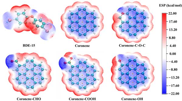 ¡¡¡¡Îª½øÒ»²½Ñо¿PBDEsÓë»îÐÔ֮̿¼äµÄ΢¹ÛÏ໥×÷ÓûúÖÆ£¬Í¨¹ý¼ÆË㻯ѧÑо¿ÁË»îÐÔÌ¿½á¹¹Ä£ÐÍÓëBDE-15Ö®¼äµÄÈõÏ໥×÷Ó᣸ù¾Ý±íÕ÷½á¹û£¬¹¹½¨ÁËÒÔÔα½Îª»ù±¾½á¹¹µÄ´¿Ì¼½á¹¹Ä£ÐÍ£¬ÒÔ¼°ôÈ»ù¡¢ôÇ»ù¡¢È©ºÍÃÑÈ¡´úµÄ½á¹¹Ä£ÐÍ£¬Ä£ÄâÁË»îÐÔÌ¿µÄ²»±¥ºÍ̼½á¹¹ºÍº¬Ñõ¹ÙÄÜÍŽṹ¡£BDE-15ºÍÎåÖÖ»îÐÔÌ¿½á¹¹Ä£Ð͵ľ²µçÊÆÈçͼ5Ëùʾ¡£BDE-15ÔÚÆääåÔ×ÓºÍÑõÔ×Ó¸½½üÏÔʾ³ö¸º¾²µçÊÆ£¬¶øÔÚÆäËûÇøÓò£¬ÓÈÆäÊÇÔÚÆäÇâÔ×Ó¸½½ü£¬ÔòÏÔʾ³öÕý¾²µçÊÆ¡£ÕâÊÇÒòΪäåÔ×ÓºÍÑõÔ×ӵĵ縺ÐÔ´óÓÚ̼Ô×Ó£¬¶øÇâÔ×ӵĵ縺ÐÔ×îС¡£ÔÚCoroneneµÄ½á¹¹ÖУ¬ËùÓеÄ̼Ô×Ó¶¼±íÏÖ³ö¸ºµÄ¾²µçÊÆÌØÕ÷£¬¶øÇâÔ×ÓÔò±íÏÖ³öÕýµÄ¾²µçÊÆÌØÕ÷¡£º¬Ñõ¹ÙÄÜÍŵÄÒýÈëÔö¼ÓÁË»ùÍŸ½½üµÄÕý¾²µçÊÆÃæ»ýºÍ¸º¾²µçÊÆÃæ»ý£¬ÊôÓڽṹÖм«ÐÔ×îÇ¿µÄÇøÓò¡£¸ù¾ÝÕý¸º¾²µçÊÆÏ໥ÎüÒýµÄÔÀí£¬BDE-15ºÍ»îÐÔÌ¿½á¹¹Ä£ÐÍ¿ÉÒÔÐγɶàÖÖ¸´ºÏ¹¹ÐÍ¡£¿ÉÒÔÍÆ²â£¬»ùÍŸ½½ü´æÔÚÇ¿¾²µçÊÆÇøÊ¹µÃBDE-15¸üÈÝÒ×Óë»ùÍŽáºÏ¡£