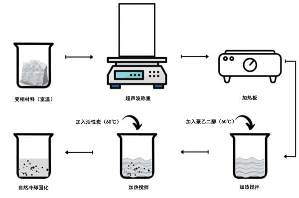 图1显示了样品制备方法的示意图。首先,将固体石蜡称重并放入样品杯中。放上热板,让温度达到60℃,加热样品杯,直到所有表面活化剂熔化。随后,将0.5%、1%或2%的表面活性剂与石蜡在500rpm的搅拌下混合,并在65℃下连续加热约10分钟。然后,将0.3%、0.5%或1%的活性炭添加到混合物中,并通过以900rpm的磁力搅拌和在65℃下连续加热约15分钟再次分散。在此步骤之后,将样品杯置于室温下进行固化。