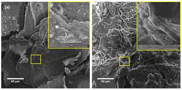 图2:含有合适佳浓度(a)石蜡和活性炭和(b)石蜡+聚乙二醇+活性炭的相变材料样品的SEM图像。