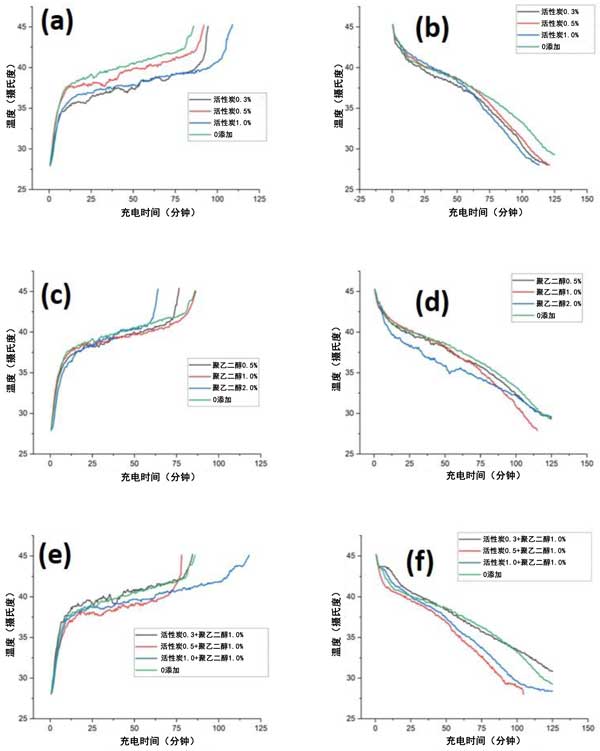 图3:(a,b)活性炭0.3%,0.5%,1%,(c,d)聚乙二醇0.5%,1%,2%,(e)不同重量比的变相材料充放电倍率,(f)活性炭为0.3%、0.5%和1%,聚乙二醇为1%。