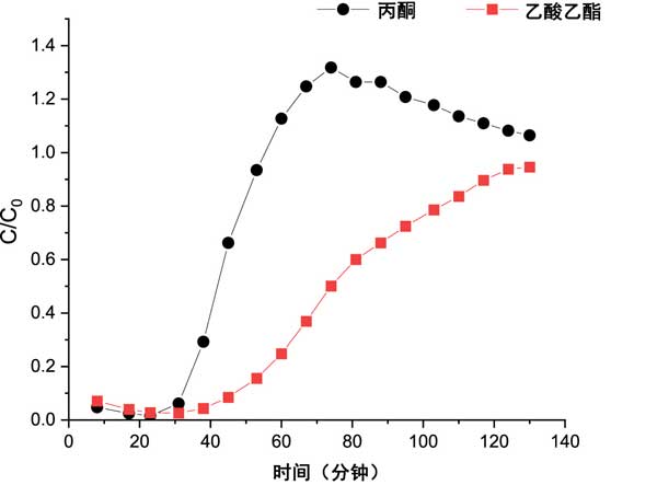 ¡¡¡¡Í¼2£º¸ÄÐÔ»îÐÔÌ¿Îü¸½±ûͪºÍÒÒËáÒÒõ¥µÄÍ»ÆÆÇúÏß¡£