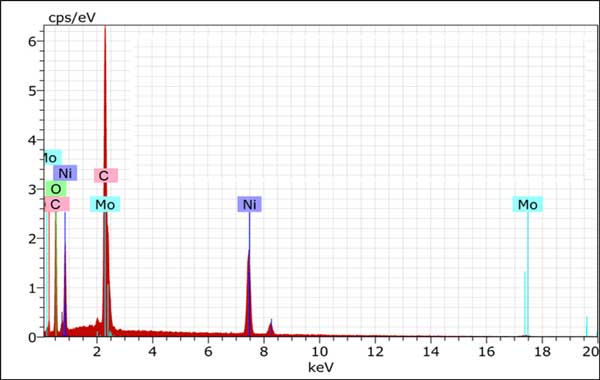 ¡¡¡¡Í¼1£º6%NiMo»îÐÔÌ¿´ß»¯¼ÁµÄEDX¹âÆ×£¬·ÖÎö֤ʵ´æÔÚÔ¼82%µÄ»îÐÔÌ¿¡¢5.7%µÄÄøºÍ14.5%µÄîâ¡£