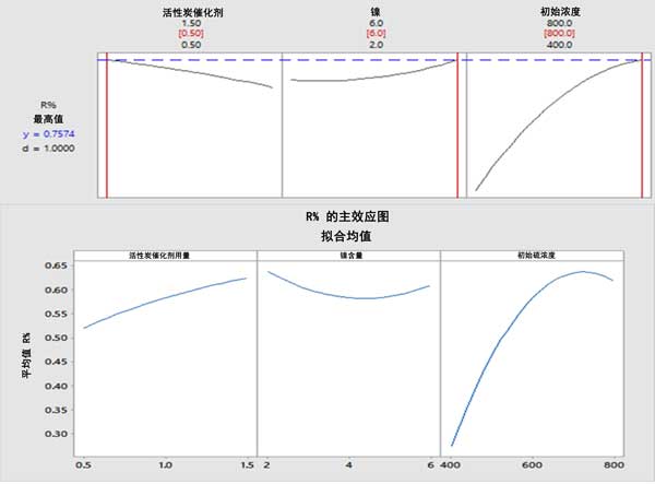 ¡¡¡¡Í¼2£ºÑо¿±äÁ¿¶Ô¶þ±½²¢àç·Ôת»¯ÂʵÄÓ°Ï죬ת»¯ÂÊËæ×Å»îÐÔÌ¿´ß»¯¼ÁÓÃÁ¿ºÍ³õʼÁòŨ¶ÈµÄÔö¼Ó¶øÔö¼Ó£¬Ëæ×ÅNi¸ºÔØÁ¿µÄÔö¼Ó¶ø½µµÍ(ÉÏͼ)¡£¶ÔÓÚ»îÐÔÌ¿´ß»¯¼ÁÓÃÁ¿¡¢Ni¸ºÔØÁ¿ºÍ³õʼÁòŨ¶È£¬ÔÚ0.5g¡¢6%ºÍ700ppmʱ£¬×î¼Ñ¶þ±½²¢àç·Ôת»¯ÂÊ·Ö±ðΪ75.74%(ÏÂͼ)¡£